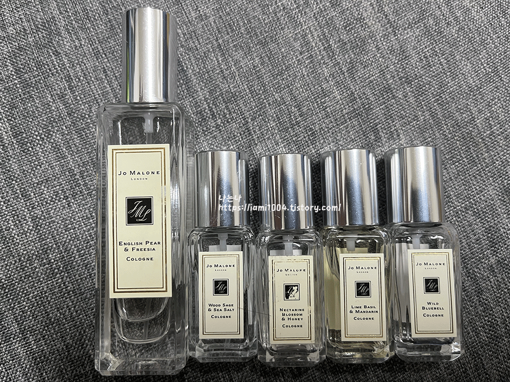 좌측부터 ENGLISH PEAR & FREESIA COLOGNE / WOOD SAGE & SEA SALT COLOGNE / NECTARINE BLOSSOME & HONEY COLOGNE / LIME BASIL & MANDARIN COLOGNE / WILD BLUEBELL COLONGE 와일드 블루벨 이외에도 조말론 향수 몇 개 더 있는데 개인적으로는 와일드 블루벨 이외에 다른 것을 고르라면 ENGLISH PEAR & FREESIA COLOGNE을 선택하고 싶다. 다른 사람의 경우에는 WOOD SAGE & SEA SALT COLOGNE도 많이 고르던데 향이라는 것이 음식 맛에 대한 기호만큼이나 사람마다 호불호가 갈리는지라 타인의 추천은 참고 정도로 하고 본인이 직접 시향해 보고 마음에 드는 것으로 고르면 된다.